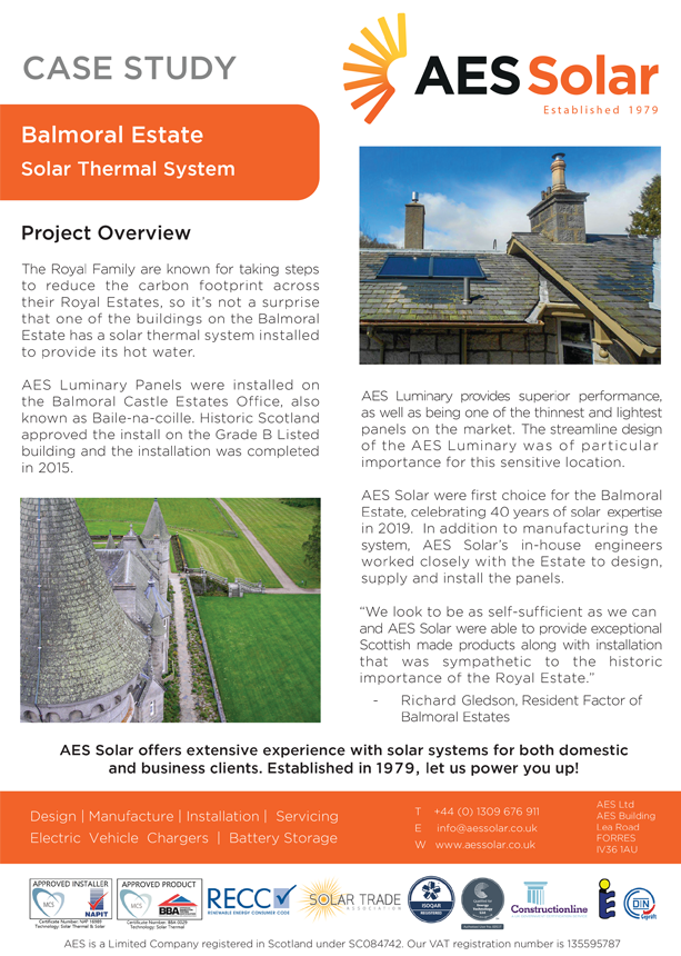 With 37 years of expertise in the solar thermal industry at the time, AES Solar were the first choice for the royal estate. We have since celebrated our 40th year of uninterrupted business in 2019. In addition to manufacturing the system, AES Solar’s in-house engineers also worked closely with the Estate to design, supply and install the panels.[/vc_column_text][/vc_column_inner][/vc_row_inner][/vc_column][vc_column css_animation=”slideInRight” width=”1/3″ css=”.vc_custom_1575546616908{background-image: url(https://www.aessolar.co.uk/wp-content/uploads/2019/12/Balmoral-2-1.jpg?id=4130) !important;background-position: center !important;background-repeat: no-repeat !important;background-size: cover !important;}”][/vc_column][/vc_row][vc_row el_class=”rowPadIn15 bgPaleOrange padT30 padB30″][vc_column width=”1/2″ el_class=”padT30″][vc_column_text]