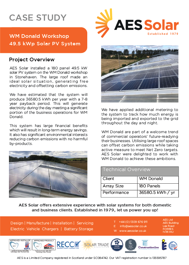 AES Solar installed a 180 panel 49.5 kW solar PV system on the WM Donald workshop in Stonehaven. The large roof made an ideal solar situation, generating free electricity and offsetting carbon emissions. We have estimated that the system will produce 36580.5 kWh per year with a 7-8 year payback period. This will generate electricity during the day meeting a significant portion of the business operations for WM Donald.